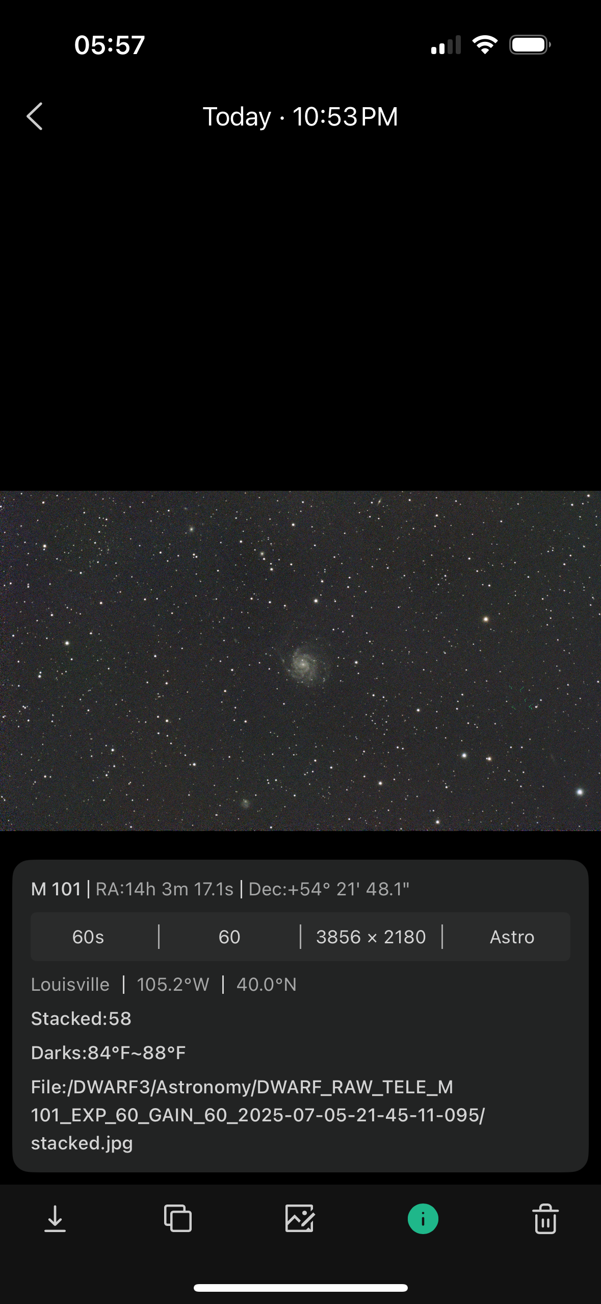 The Pinwheel Galaxy; 58 subs, 60 seconds, 60 gain, astro filter