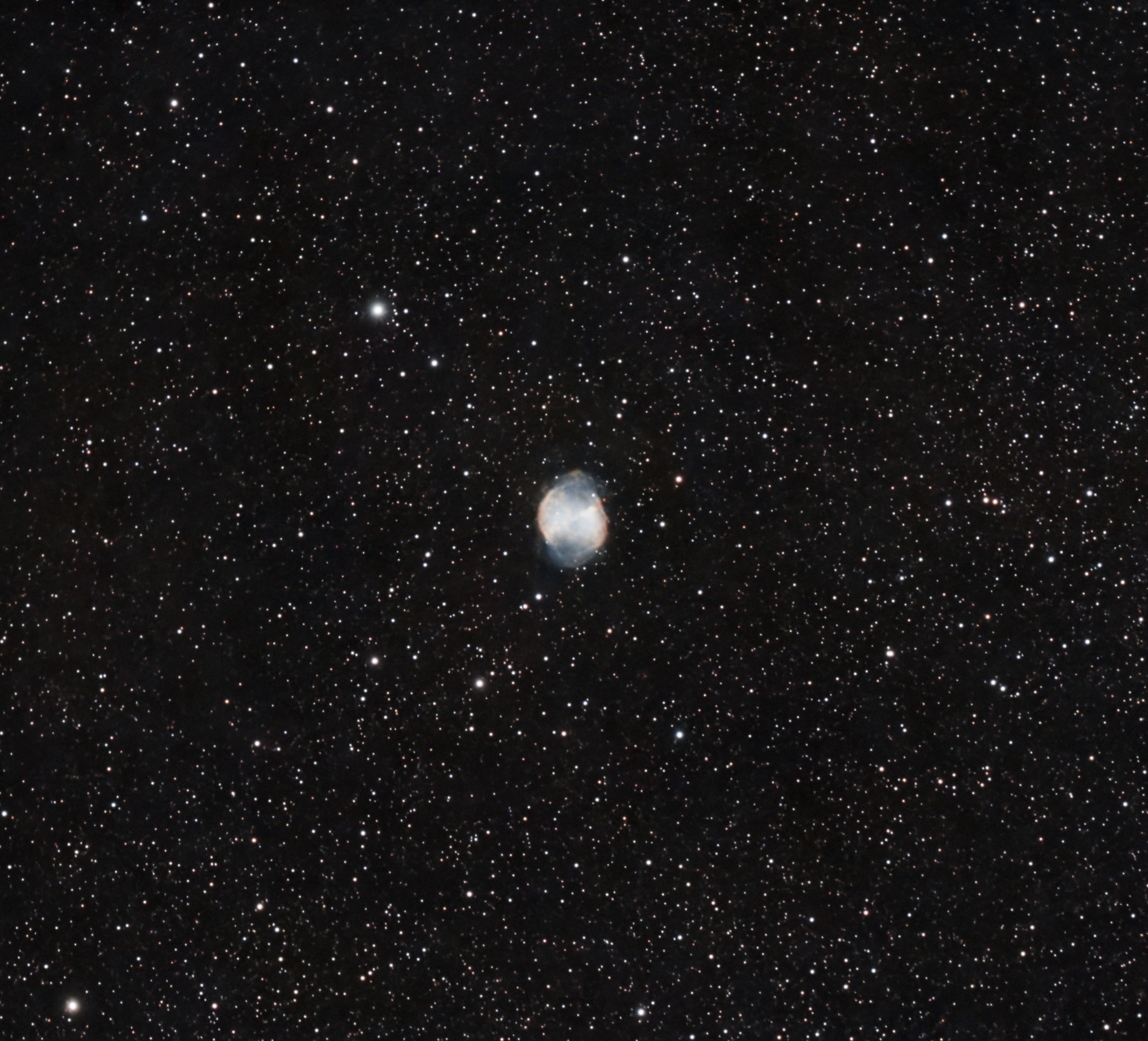 After failing to get the Dumbbell Nebula, M 27, a few nights ago, I decided to put the telescope on top of the van and try again. I had recently taken some darks with the gain set to higher-than-60, so I decided to try 80. Here’s the dumbbell, 482 lights at 15 seconds, 80 gain.