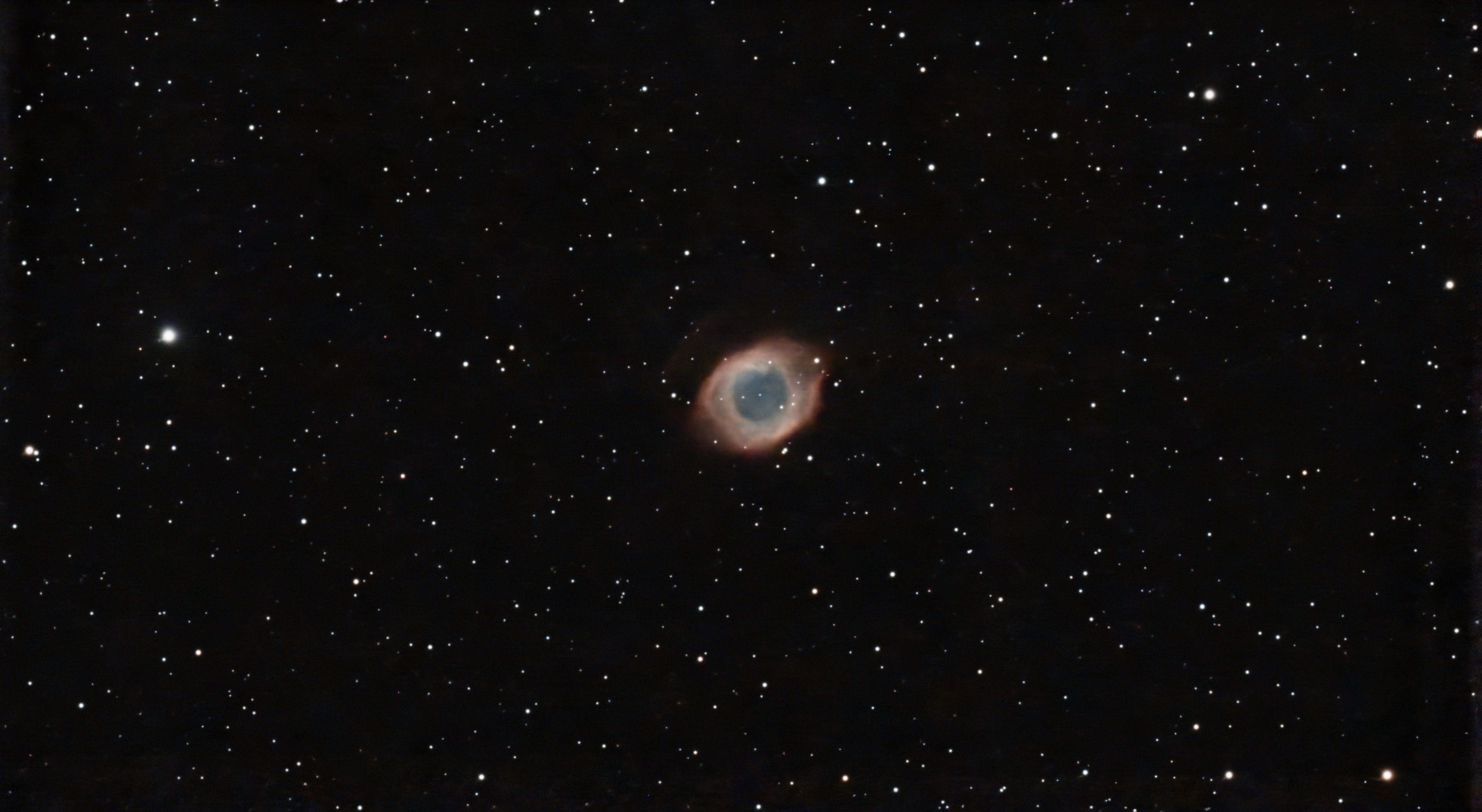 Things went well at first, but then clouds rolled in from the west and covered the southern part of the sky. That was too bad, because I was trying to get the Helix Nebula, which is at −21° declination, putting it in the southern sky. I lost 187 of my 231 subs due to clouds. Here is what I was able to salvage.