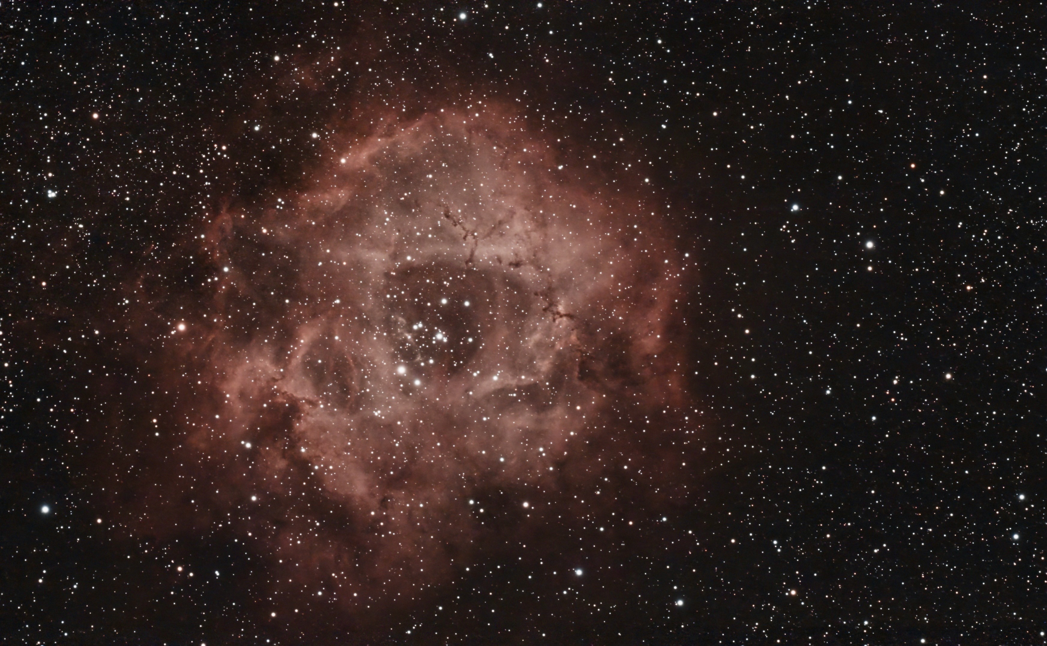 Rosette Nebula, NGC 2237; 213 subs, 60 secs, 60 gain, duo filter; taken early November 12 and 14 from Monsters’ Clubhouse
